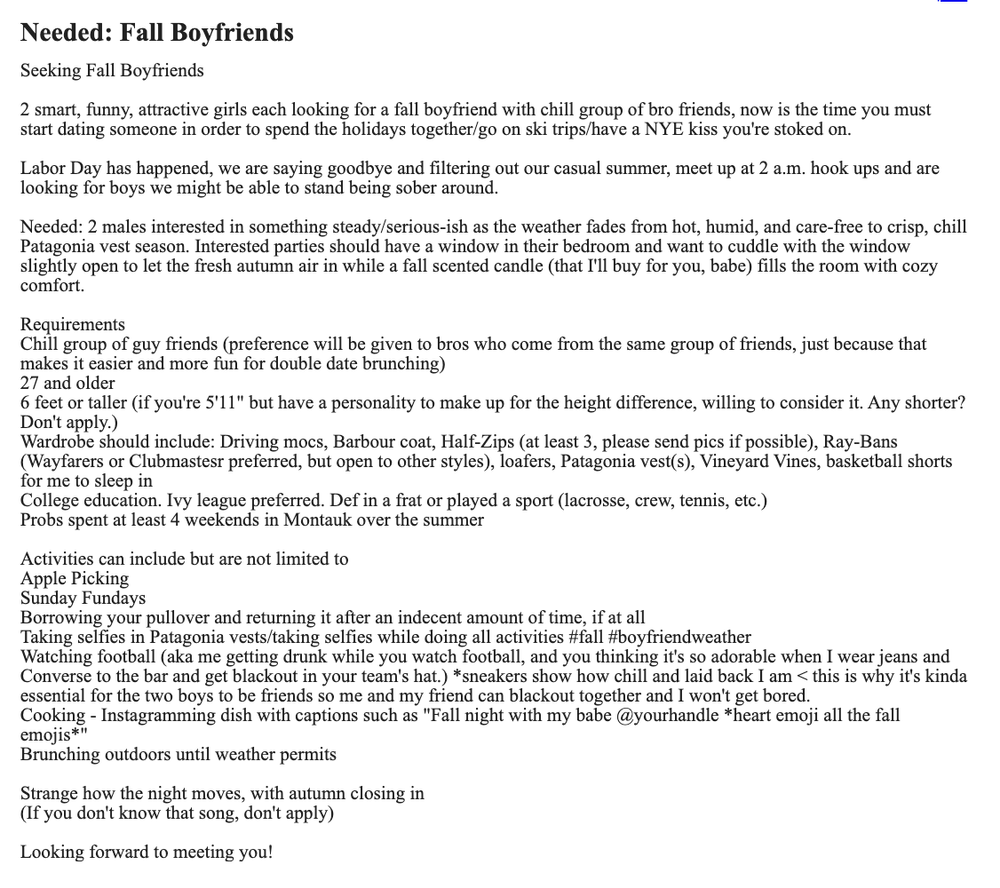 Summer flings are fun, but as soon as the leaves turn, it's time to find someone or face a long, cold, lonely winter. To poke fun at this shift in dating priorities,, my friend Mel and I posted a satirical Craigslist ad on Labor Day weekend seeking “Fall Boyfriends.” By Monday, the ad had gone full-on viral.